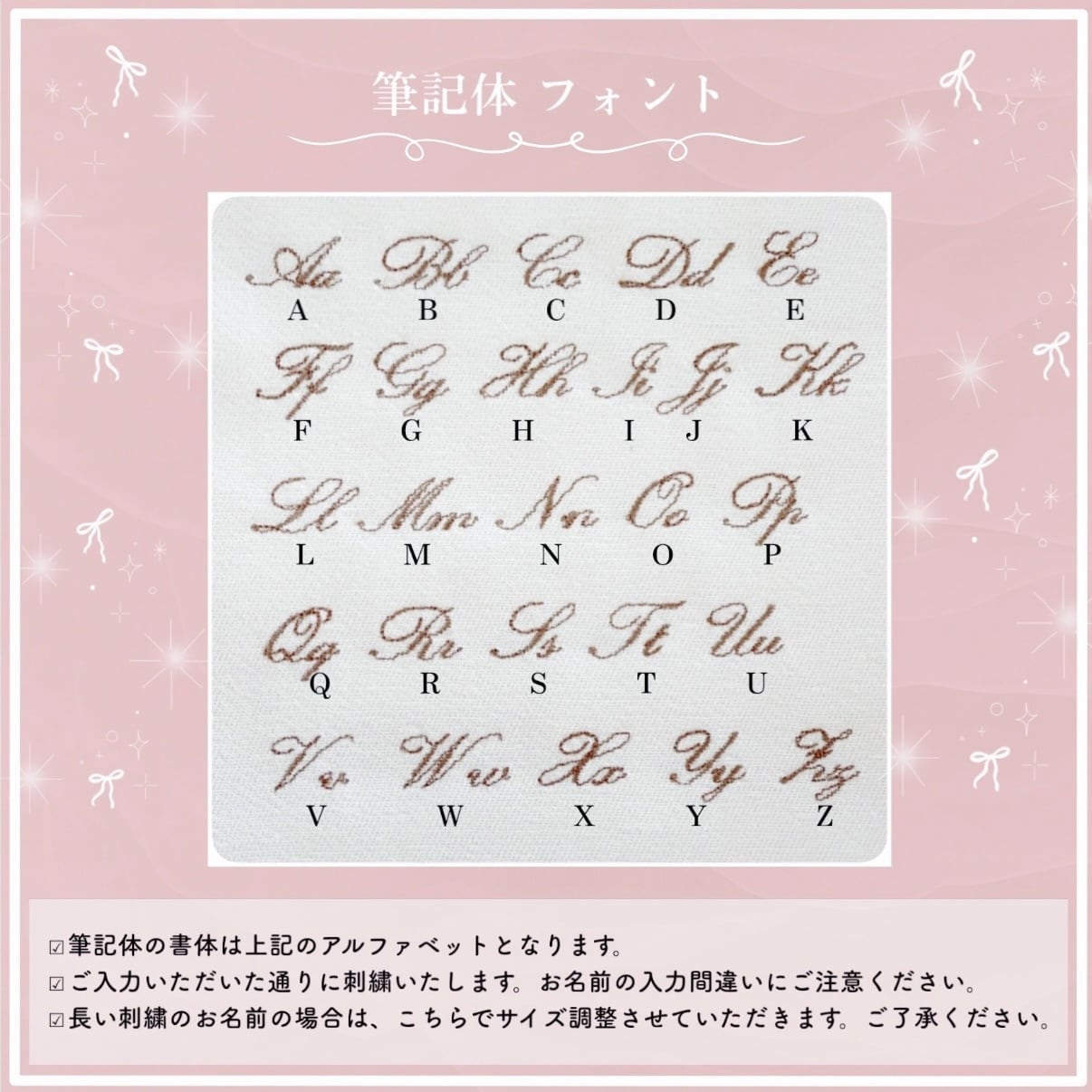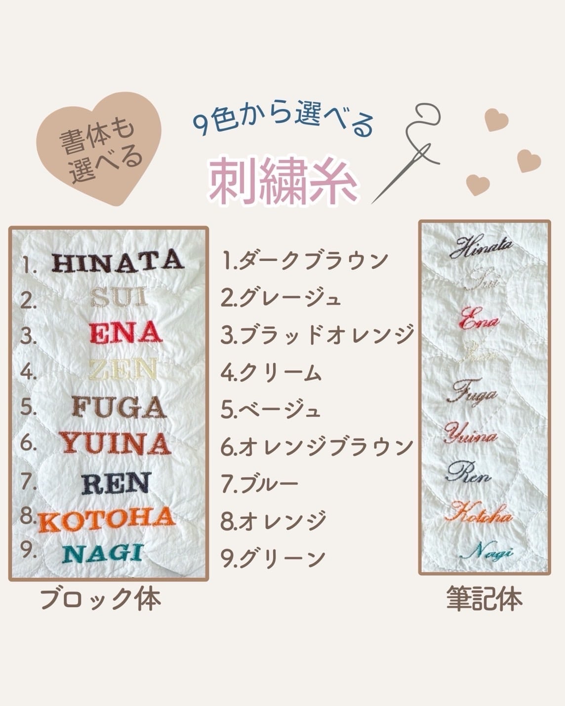 刺繍文字がブロック体と筆記体から刺繍選べるようになります。